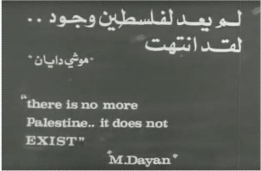 The headline of Figure 3 as, “There is no more Palestine… It does not EXIST” exacerbates the cultural erasure through the capitalization and denotation of ‘Exist’ to the full stop of the statement — the contrast of ‘no more’ to ‘exist’ consciously elucidates a present existence, which can only be exterminated, hindered, injured, or sequester in order to deliver the promise of the statement. Through a present reception, the use of film, categorically shies away from social media within the five decades since it release, yet the removal of orality for the replacement of falling rubble, initiated a present depiction of ecological and physical devastation amongst Palestinian land and their people. It simply appears that Abu Ali’s understand of pathea within his film, characteristically shelters the Western opinion, overshadowing the generational pain, muted despair, and consistent violence to fit into the nature of aestheticism for saviour complexes.