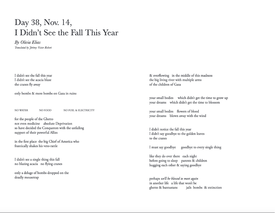 Arab Lit. 2023. ‘A Poem by Olivia Elias from Day 38, Nov. 14’, ARABLIT & ARABLIT QUARTERLY <https://arablit.org/2023/11/18/a-poem-by-olivia-elias-from-day-38-nov-14/>